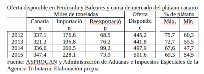 Con estas cifras, la cuota de mercado del plátano canario se habría movido en 2015 entre un mínimo del 54% y un máximo del 69%, dependiendo de cuánto de lo que se reexportó fue plátano o banana, una cuestión que las estadísticas aduaneras no recogen. Ahora bien, dado que la mayoría de esas reexportaciones fueron a Portugal –el 90% del total-, tradicional mercado de destino de los excesos de oferta de plátano de Canarias, la cuota de mercado de este último ha debido situarse en 2015 más cerca del 55% que del 69%. Calculada de esta manera la cuota de mercado del plátano isleño, aunque se hayan mejorado un par de puntos porcentuales respecto a 2014, la tendencia es negativa en los últimos ejercicios.