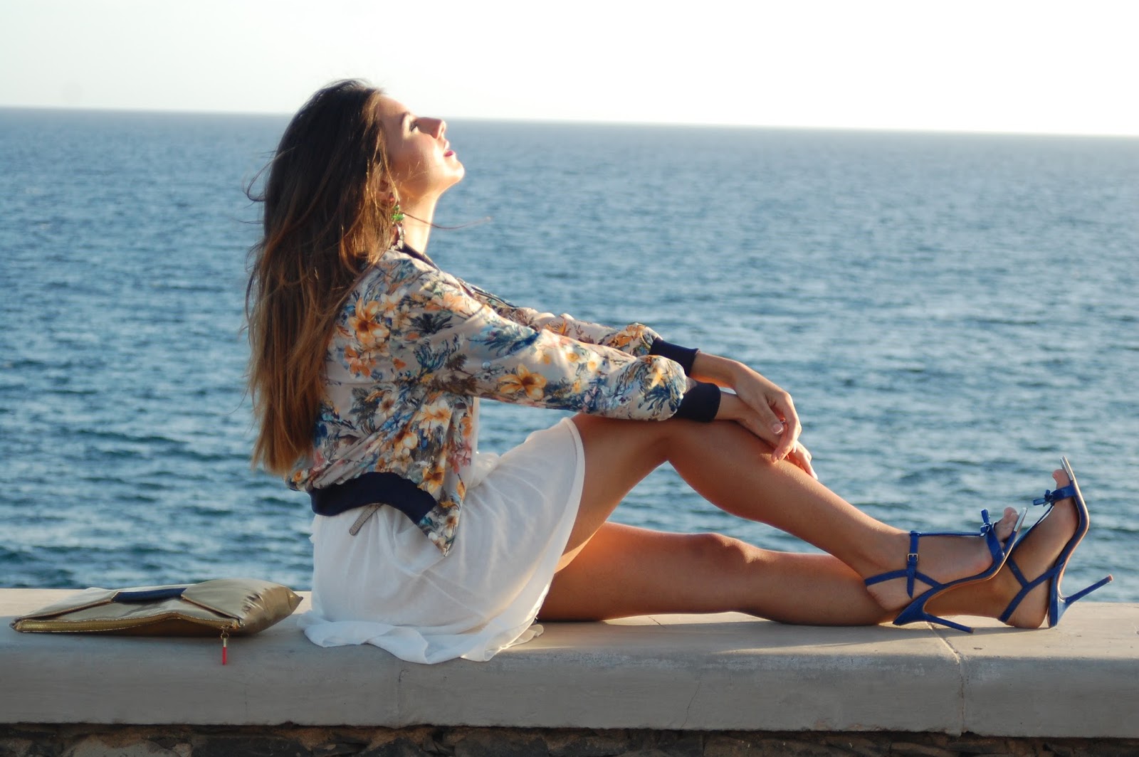...Con la caída del sol, la tarde siempre refresca, así que añadí una de las piezas de esta temporada, la bomber. Yo estoy encantada con estas piezas reinventadas, en mil estilos, desde estampados y cremalleras hasta las lentejuelas. Por cierto, un detalle que me gusta mucho, es el juego que hice con el color azul añadiendo las sandalias de tacón para que resaltara con las pinceladas del estampado de la cazadora. Me rechifla!!!!