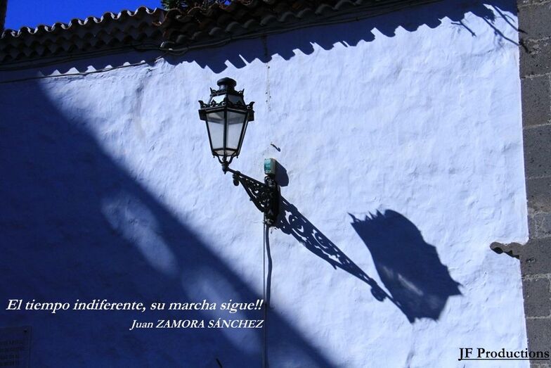 No sé cómo algunos versos se hacen presentes cuando menos se les espera. Tampoco puedo explicar por qué la imagen me trajo las palabras del cronista ¡90 años después de ser impresas! Y creo que ambos elementos están íntimamente relacionados. Son las palabras de los poetas palabras verdaderas, salidas de la profundidad de su alma visionaria. Y para mí se han convertido en una imagen: farola, día azul, blanco y sombra en la fachada: elementos cambiantes a medida que transcurre el día: todo, inexorablemente, va mudando de sitio. Por eso deja bien claro Juan Zamora que el tiempo su marcha continúa. Además, el adjetivo “indiferente”, no solo acompaña a “tiempo”, sino que marca también al que lo lee. ¡Cuán indiferentes nos mostramos a veces! Y aquí el poeta, sin decirlo, nos habla de aprovechar el aquí y el ahora. Entronca el cronista con el “Carpe Diem”, del que Garcilaso de la Vega diera buena cuenta. Lo que quiero decir es que ese verso no es un verso cualquiera. Es un aviso y una reflexión del que ha sabido, y sabe, manejar las palabras para decirnos que nuestro instante es este. Y no hay otro. Por eso la coma casi en la mitad del verso. Y la farola, en el centro de la imagen.