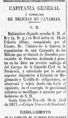 *Guardia Provincial: Cuerpo de las milicias canarias, dependiente de la Capitanía General, creado en 1877, que prestaba servicio análogo al de la Guardia Civil en la península, hasta la llegada de ésta a las islas en 1898.