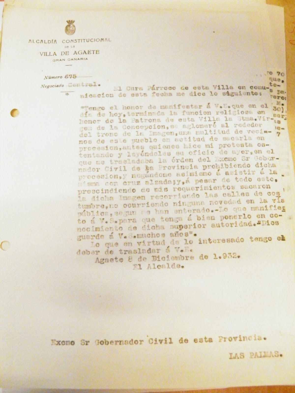 El alcalde el mismo día 8, da cuenta al Gobernador Civil, poniéndose en marcha un expediente administrativo que termina con una multa al párroco, al igual que el de Teror y el del Puerto de la Luz, por hechos similares.