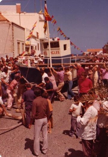 Seguidamente, aprovechando la pleamar, con la colaboración de los marineros de las Nieves, vecinos y chiquillería, en medio del sonido de los voladores, se procedió al arrastre de la embarcación desde el solar de su construcción a la cercana playa del muelle viejo.