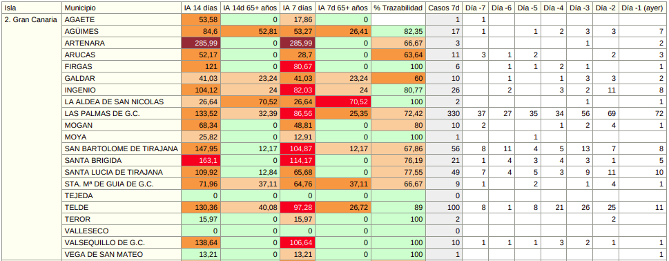 La Comarca, mantiene, según el aplicativo de Grafcan, 17 casos activos; 3 para la villa de Firgas, 4 para la ciudad Gáldar, 3 para la villa de Teror, 1 para Santa María de Guía, 3 para la villa de Agaete, uno para Artenara y 2 para La Aldea de San Nicolás. De los once municipios que componen la Comarca, 3 de ellos; Arucas, Moya, Tejeda, se encuentran sin casos activos de COVID19.