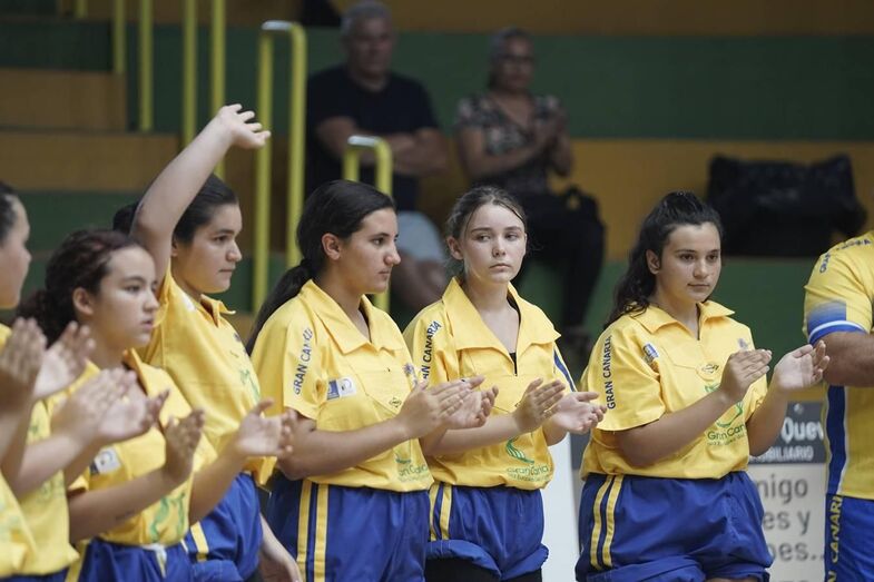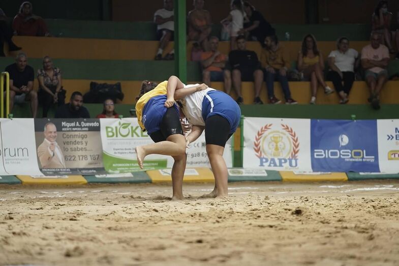 Primero fue el turno de la categoría femenina, donde el dominio de las tinerfeñas fue palpable desde las primeras agarradas. Pudieron verse multitud de mañas diferentes, muestra de la mejoría técnica y física de unas luchadoras femeninas cuyo aumento en fichas en toda canarias brinda mayores posibilidades de competición, y por ende, mayor espectáculo en la arena. En este caso la contienda finalizaría 8-27 para las de Tenerife.
