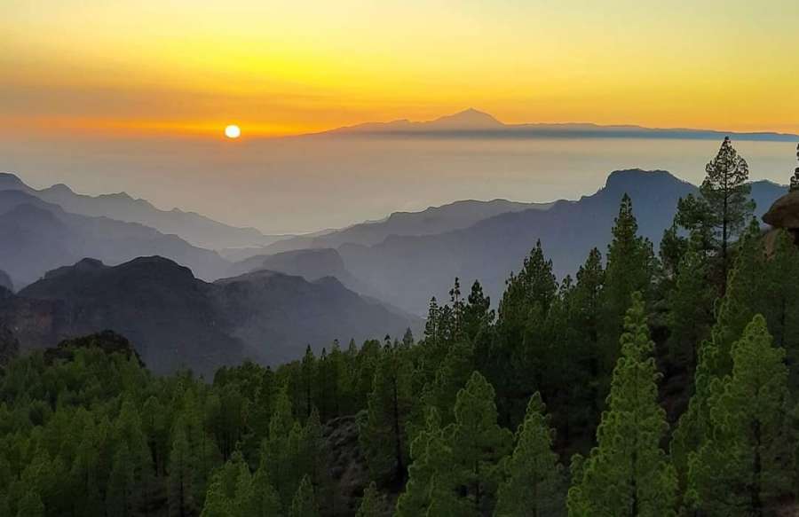 Se pierde la mirada del fotógrafo entre los pinos erguidos y frondosos, por las montañas superpuestas: Altavista, Tamadaba, Mesa del Junquillo… hasta llegar a La Aldea, para adentrarse luego en un mar cubierto de nubes y en el cielo, con el sol poniente como punto de fuga que se deshace en colores para envolver al Teide altanero y sensual.