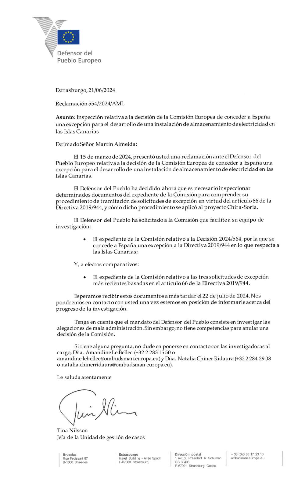 En un segundo escrito fechado el 21 de junio, la Defensora del Pueblo explica que ahora ve motivos para abrir una investigación, por lo "que es necesario inspeccionar determinados documentos del expediente de la Comisión para comprender su procedimiento de tramitación de solicitudes de excepción en virtud del artículo 66 de la Directiva 2019/944, y cómo dicho procedimiento se aplicó al proyecto Chira-Soria. “El Defensor del Pueblo ha solicitado a la Comisión que facilite a su equipo de investigación: