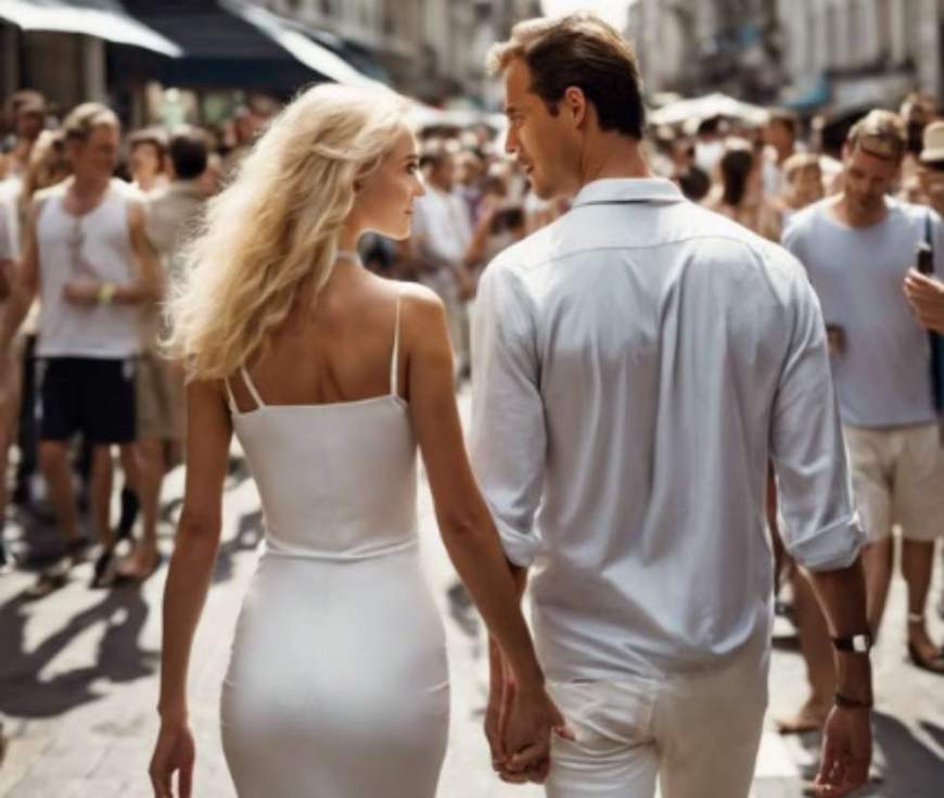 Se da un respiro junto a la escultura de Chirino para recomponer su impoluto vestido blanco con un sugerente escote, que acaba en una falda de tubo sobre sus rodillas. Mira al frente antes de reanudar dignamente su camino, y sus miradas se encuentran. Fiel a su estilo, avanza sin hacer ademán alguno, pero frente al restaurante de comida rápida, al pasar junto a él, sus miradas se enganchan, diciéndose todo sin hablar de nada.