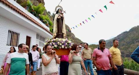 Al comienzo de la eucaristía el grupo de Bailarines y Tocadores del Norte de la isla de El Hierro se despidieron, una año más, de la Villa de Moya danzando ante San Antonio, al ritmo de los característicos tambores, chácaras y pitos, ofreciendo un espectáculo único.