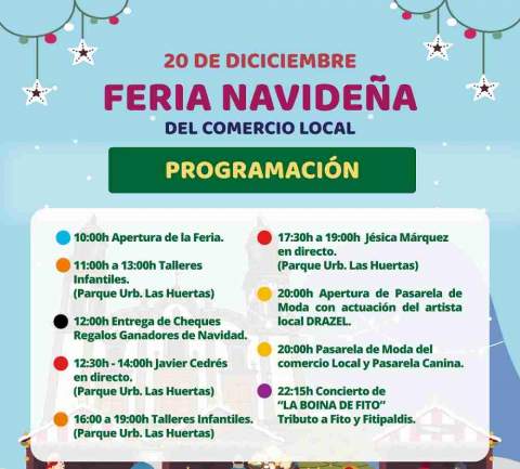El domingo 21 de diciembre la Plaza de los Faycanes concentrará la tradicional recogida de juguetes amenizada por el grupo Divershow y su musical infantil “En Busca de la Magia.” A las 18:30 será el turno de “El Zapatero Real”, de Camino Viejo Producciones, la historia de un humilde zapatero que terminará al servicio del rey con la ayudade unos increíbles duendes. Tendrá lugar en el Centro Cultural Guaires. Entradas disponibles en entradas.galdar.es. Y a las 20:00 la Plaza de Santiago despide la semana con el concierto de Nuria Fergó.