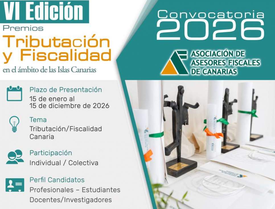 La Asociación de Asesores Fiscales de Canarias (AFC) anuncia hoy, jueves15 de enero de 2026, la apertura de la convocatoria para la VI Edición de los Premios de Trabajos en Tributación y Fiscalidad en el ámbito de las Islas Canarias.