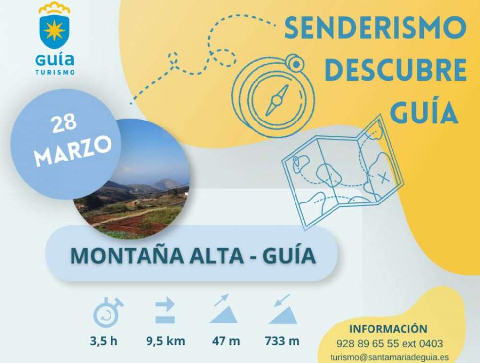 El programa de senderismo “Descubre Guía” arranca este sábado 28 de marzo con un precioso recorrido que partirá desde el barrio de Montaña Alta, en las medianías, hasta el casco de Guía. La inscripción ya se encuentra abierta hasta este jueves 26 a través de este enlace, donde las personas interesadas podrán encontrar todos los detalles sobre la ruta. El coste es de 10 euros. Más información en la Oficina de Turismo o llamando al teléfono 928 89 65 55 (Ext 0403).
